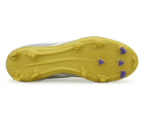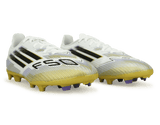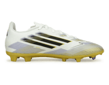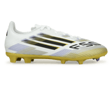 The adidas Kids F50 League FG/MG soccer cleats in White/Black/Gold are built for young players looking to boost their speed and agility. A stretchy tongue and lightweight Fiberskin upper with Sprintgrid detailing on the forefoot support quick movements and fast acceleration. Designed for firm ground and multi-ground play, the Sprintplate 360 outsole helps deliver explosive propulsion, letting kids play at full pace with confidence. A featured silo from the adidas Road to Glory Pack 2025.