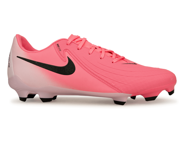 The Nike Men's Phantom GX II Academy FG/MG Sunset Pulse/Black cleats are designed to elevate your game to the next level. Featuring NikeSkin technology covering the striking area, they provide enhanced control and precision whether you're organizing plays, assisting teammates, or finishing goals. The expanded NikeSkin touch zone ensures better ball control in wet or dry conditions, while the Nike Cyclone 360 traction pattern offers improved agility and secure movement, allowing you to cut with speed and confidence. Additionally, the soft upper ensures a comfortable fit throughout the game. These cleats are suitable for use on both natural and synthetic surfaces and come with a cushioned insole for added comfort.