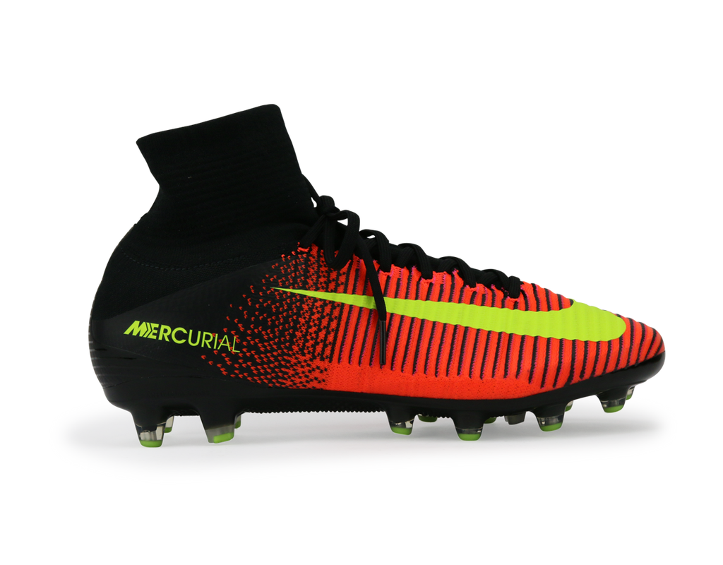 The Nike Mercurial Superfly V AG-PRO Men's Artificial-Grass Soccer Cleat provides stability and exceptional ball touch. Its AG-PRO plate enhances comfort with a heat-resistant layer. Dynamic Fit collar and Flyknit upper with integrated ribbing for ball control. All Conditions Control (ACC) technology for better control in challenging conditions. AG-Pro plate maximizes traction and minimizes heat on artificial grass.